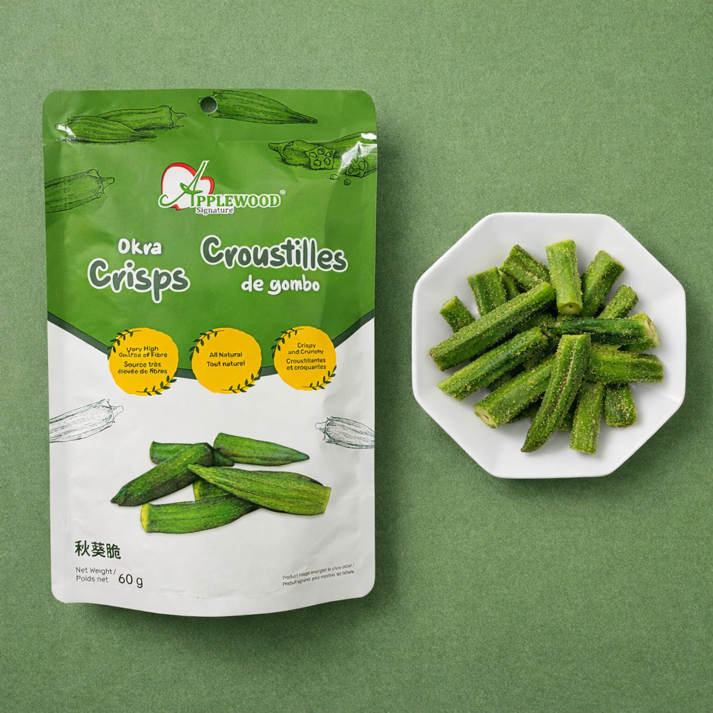 Sourced from Shandong, China, okra is known for its high nutritional value, providing an excellent source of dietary fibre and high concentrations of vitamins A, B, C, and K. It is also an important source of calcium, potassium, iron, zinc, and folate. Our okra is produced through vacuum frying to create a healthier Asian snack option.