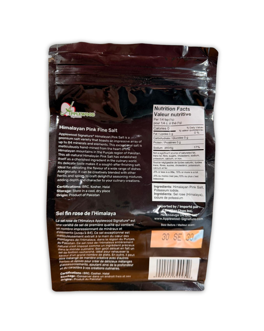 Consisting mostly of sodium chloride, this 1 kg Stand Up Pouch Fine Salt of Applewood Signature® Himalayan pink salt also contains over 84 trace minerals. These include common minerals like magnesium, potassium, and calcium, as well as lesser-known minerals such as strontium and molybdenum. Originally sourced from an ancient sea that existed before humankind (and before pollution), our pink Himalayan salt is rich in minerals and contains zero microplastics. Expiry date free, hand-mined and ground, Himalayan salt forms all naturally compared to sea salt.